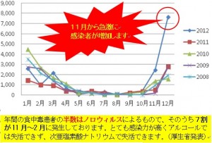 これからの時期、例年インフルエンザなどが流行ります。 ノロウィルスも下表のように、急激に増加しま…