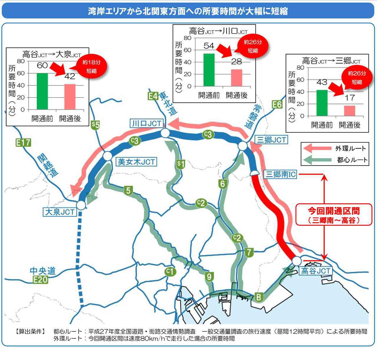 この開通により、千葉の湾岸方面から埼玉や北関東に行く際に都心を通らずに 行けるようになり、時間も18分~26分…