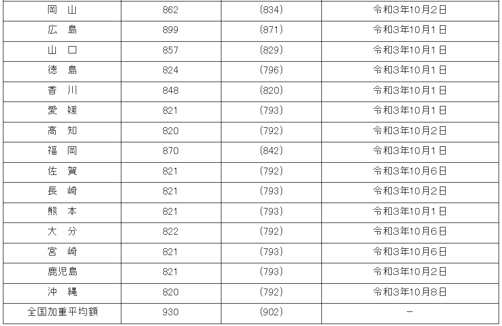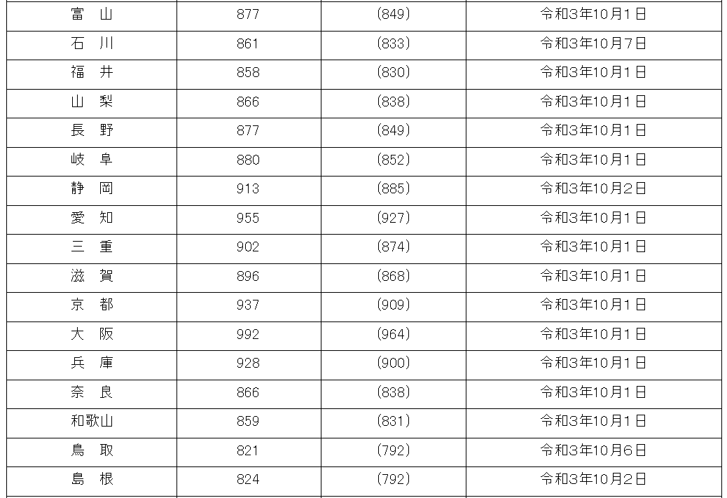 令和3年度 地域別最低賃金額、及び発効年月日は、以下のとおりです。