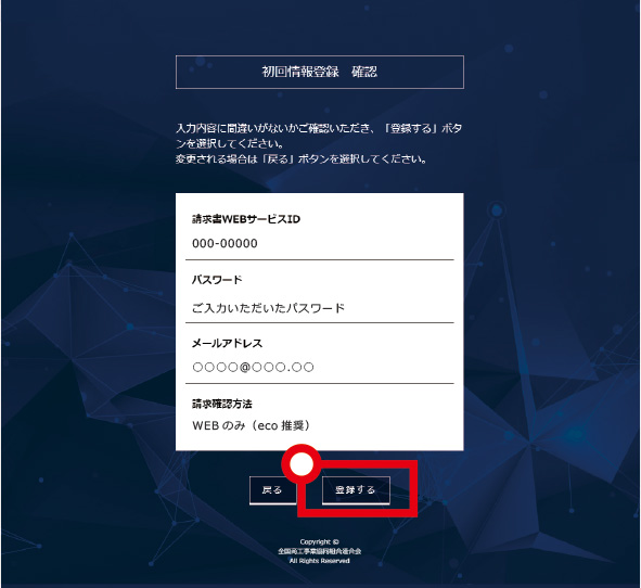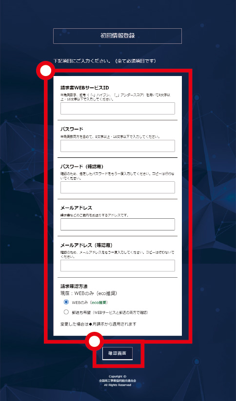 4.ID・パスワード・メールアドレス・請求確認方法を入力し「確認画面」ボタンをクリック