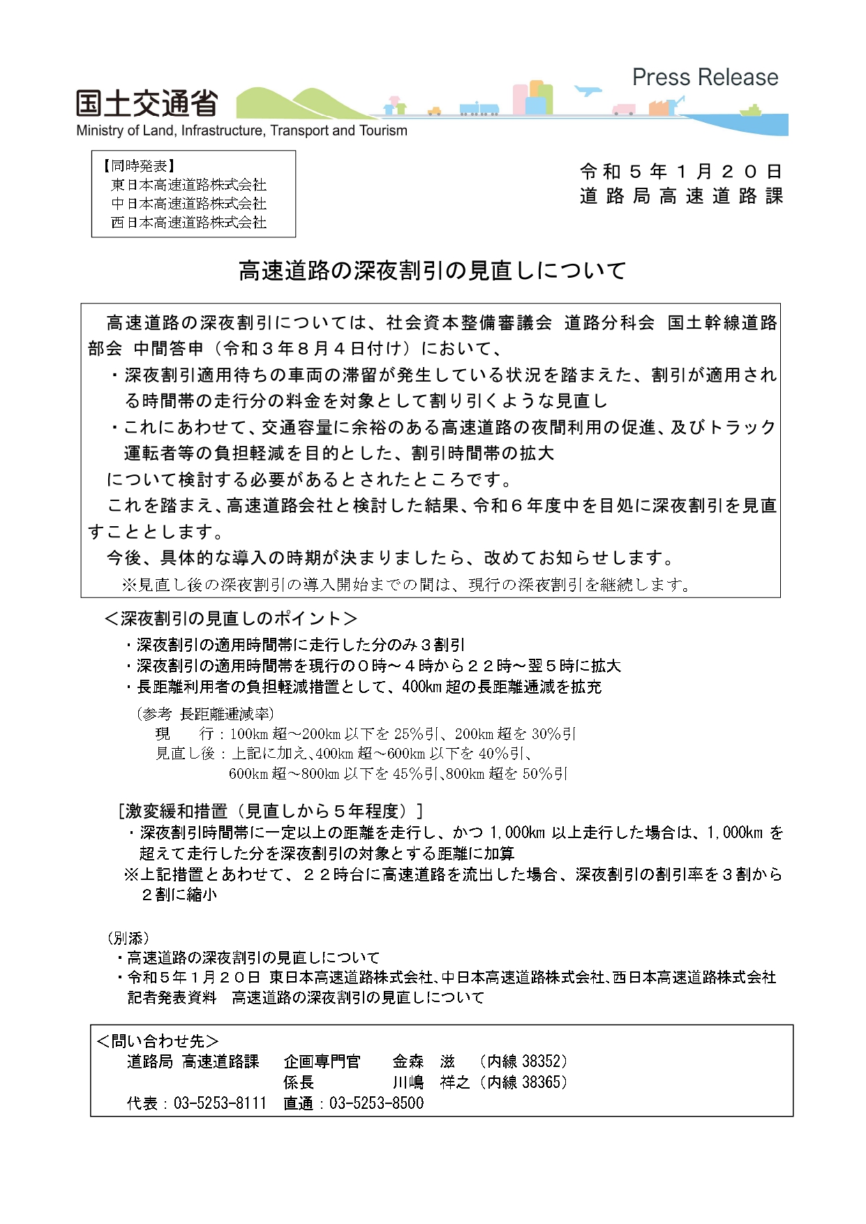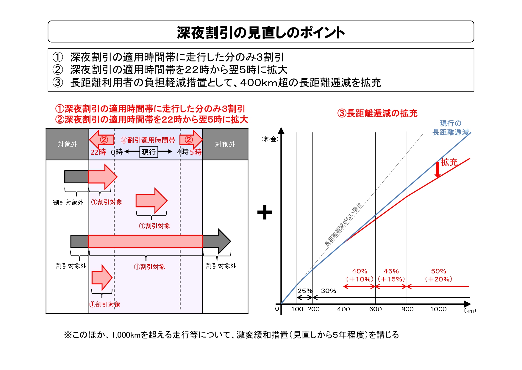 国土交通省、高速道路会社三社より、深夜割引の見直しについて発表がありました。