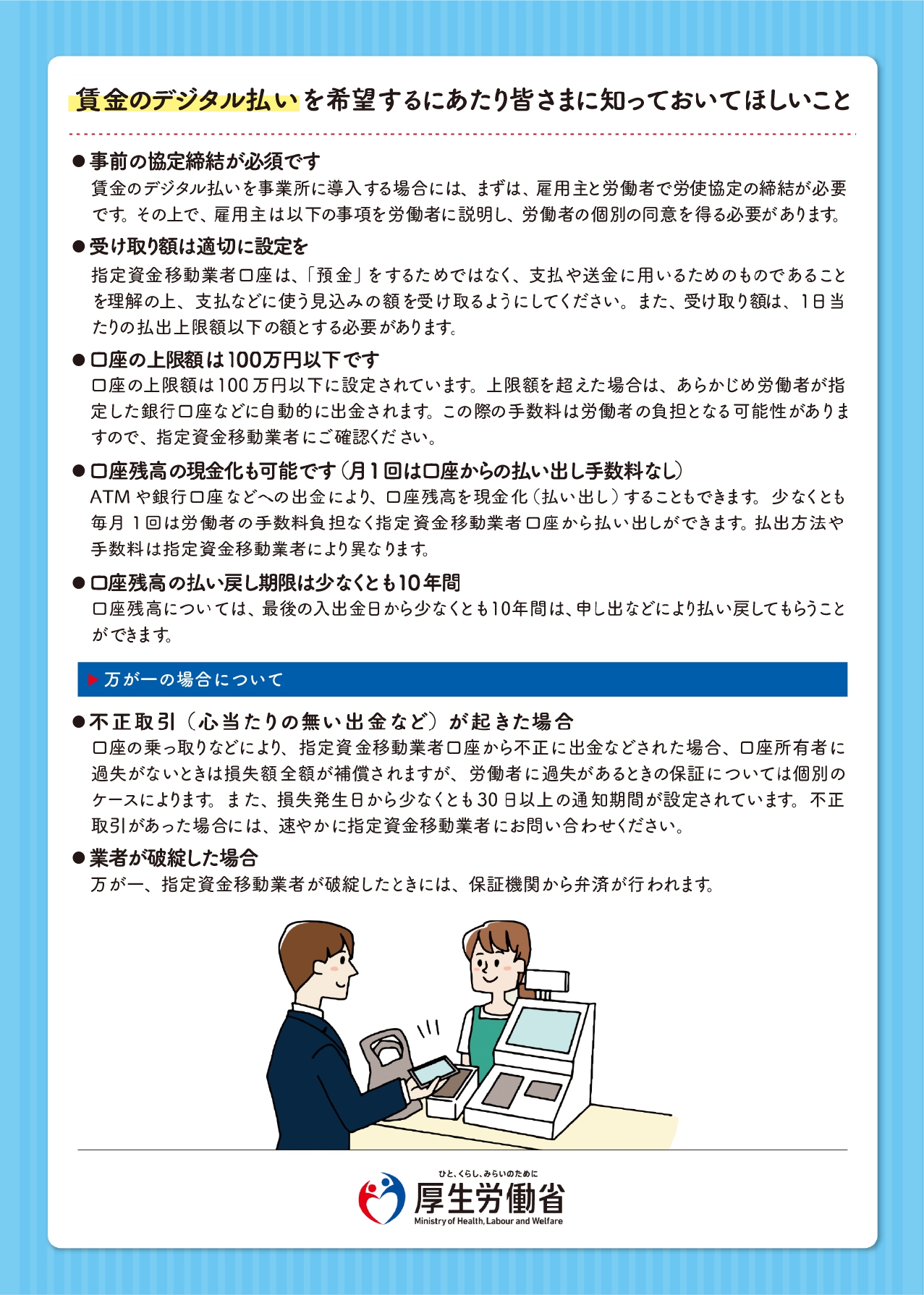 厚生労働省は、賃金をデジタルマネーの取扱い業者の口座で